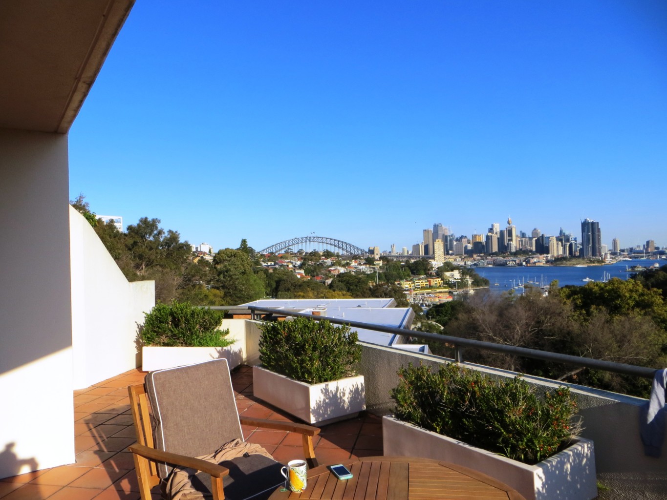 The lobby is really modern and swish. As soon as I walked through the door into the apartment the amazing view struck me. 180 degree views of Sydney harbour through floor to ceiling windows! It’s on the top floor with a huge wrap round balcony. The layout is ideal. I can see the harbour bridge from my bedroom! The location is great. Right above the train station with cafes, supermarket and chemist etc downstairs. No train noise. Lovely bush walks and harbour views on the doorstep. I couldn’t have imagined finding such a great place!